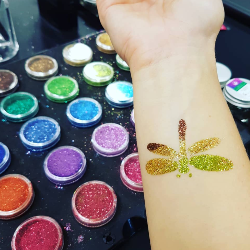 Superglittriga tatueringar som håller i upp till en vecka. Tatueringarna är vattentåliga och tas enkelt bort med babyolja eller handsprit. Glittret fästs med ett limm som är hud- och allergivänligt. Motivet appliceras med stenciler och det finns mängder av varianter att välja på från enhörningar till skorpioner, fjärilar och hajar.