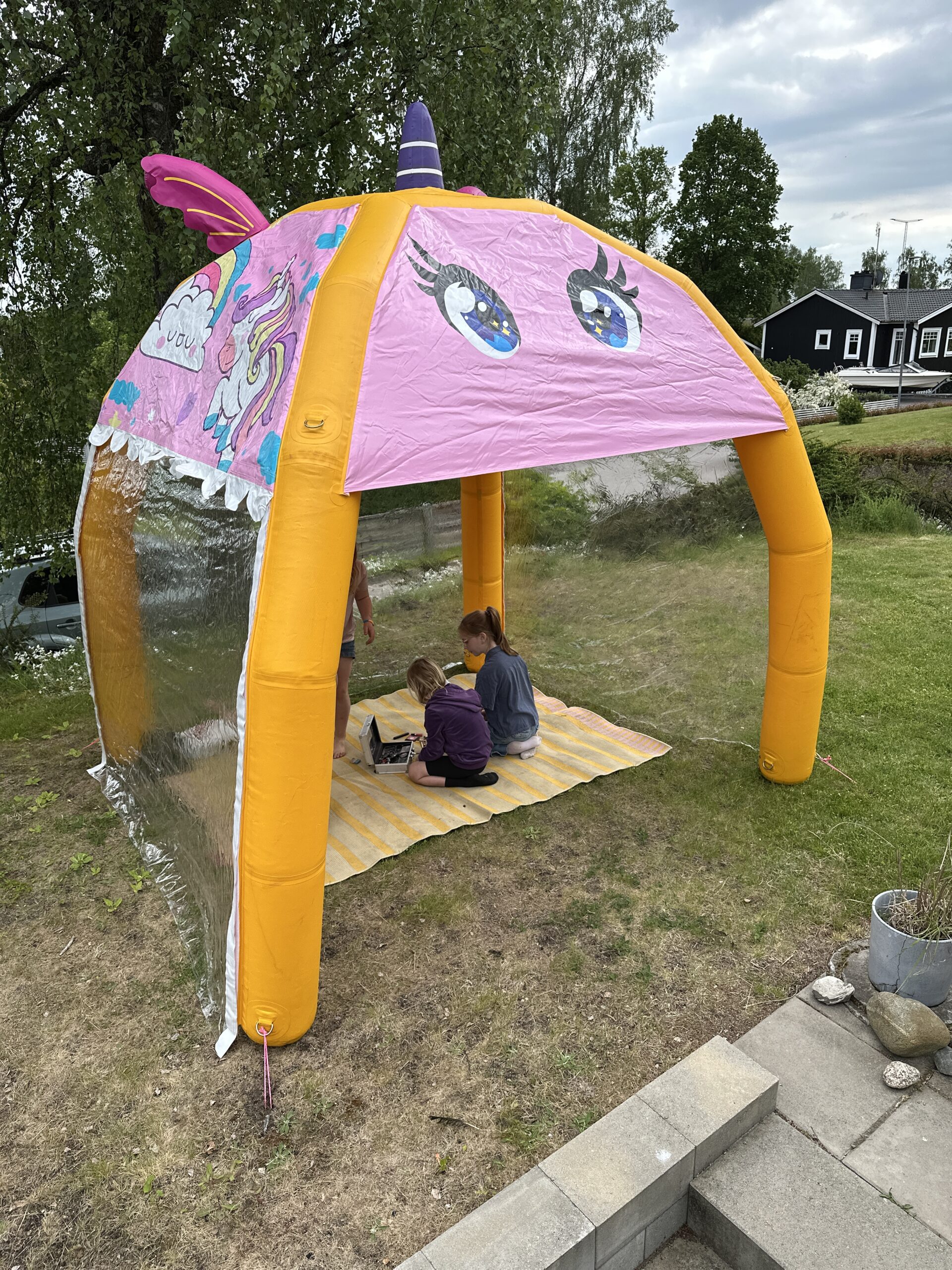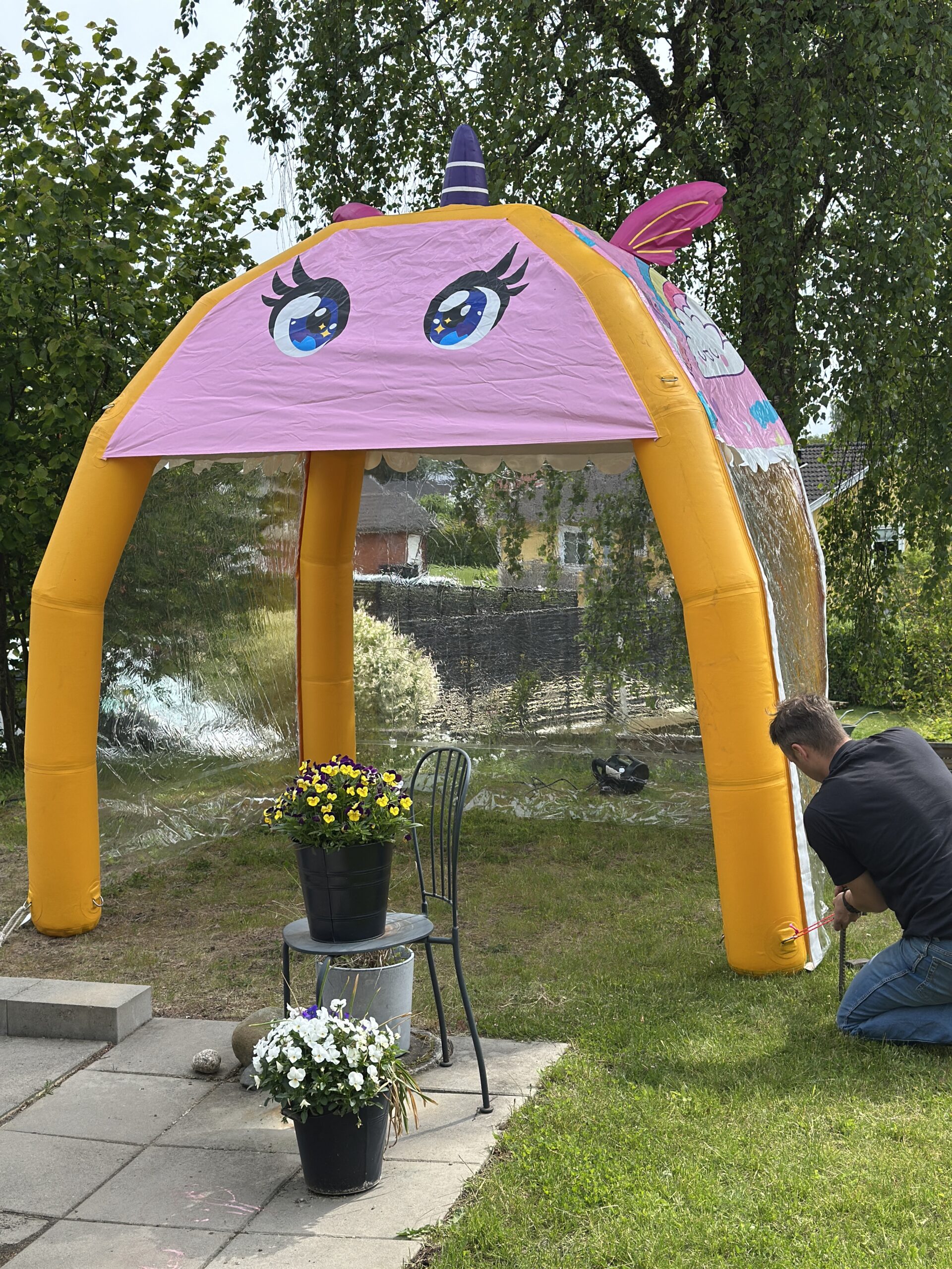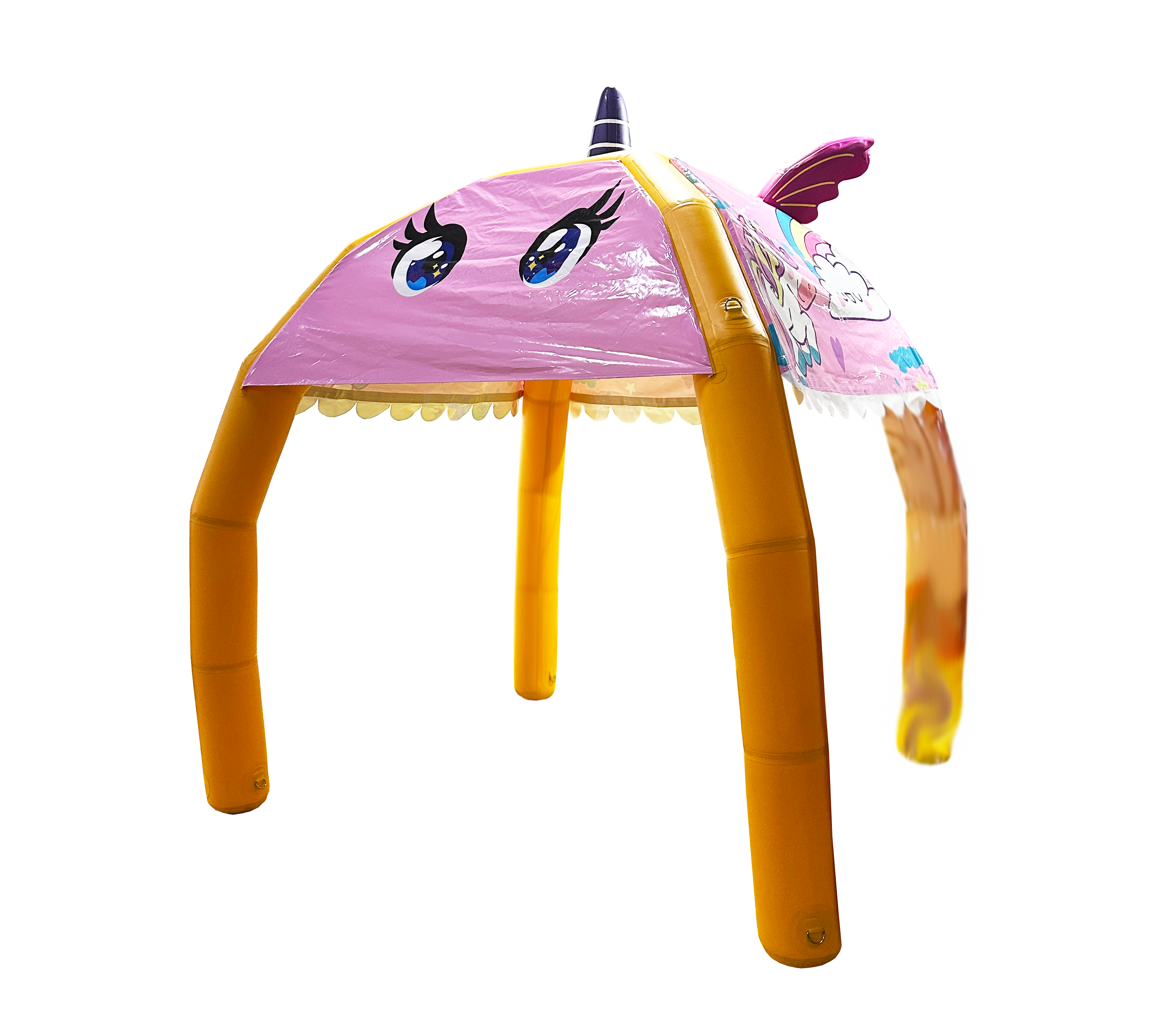 Detta unikt designade tält kommer med transparenta sidor som kan väljas att ha på eller inte. Perfekt att hyra till festival, mässor eller event. Kan även väljas att hyras tillsammans med fällbara bord, stolar och bänkar. OBS! Det finns ett större och mindre enhörningstält. Detta är det mindre. Det större är i dubbel storlek 4x4m och kommer även med fantasibakgrund.