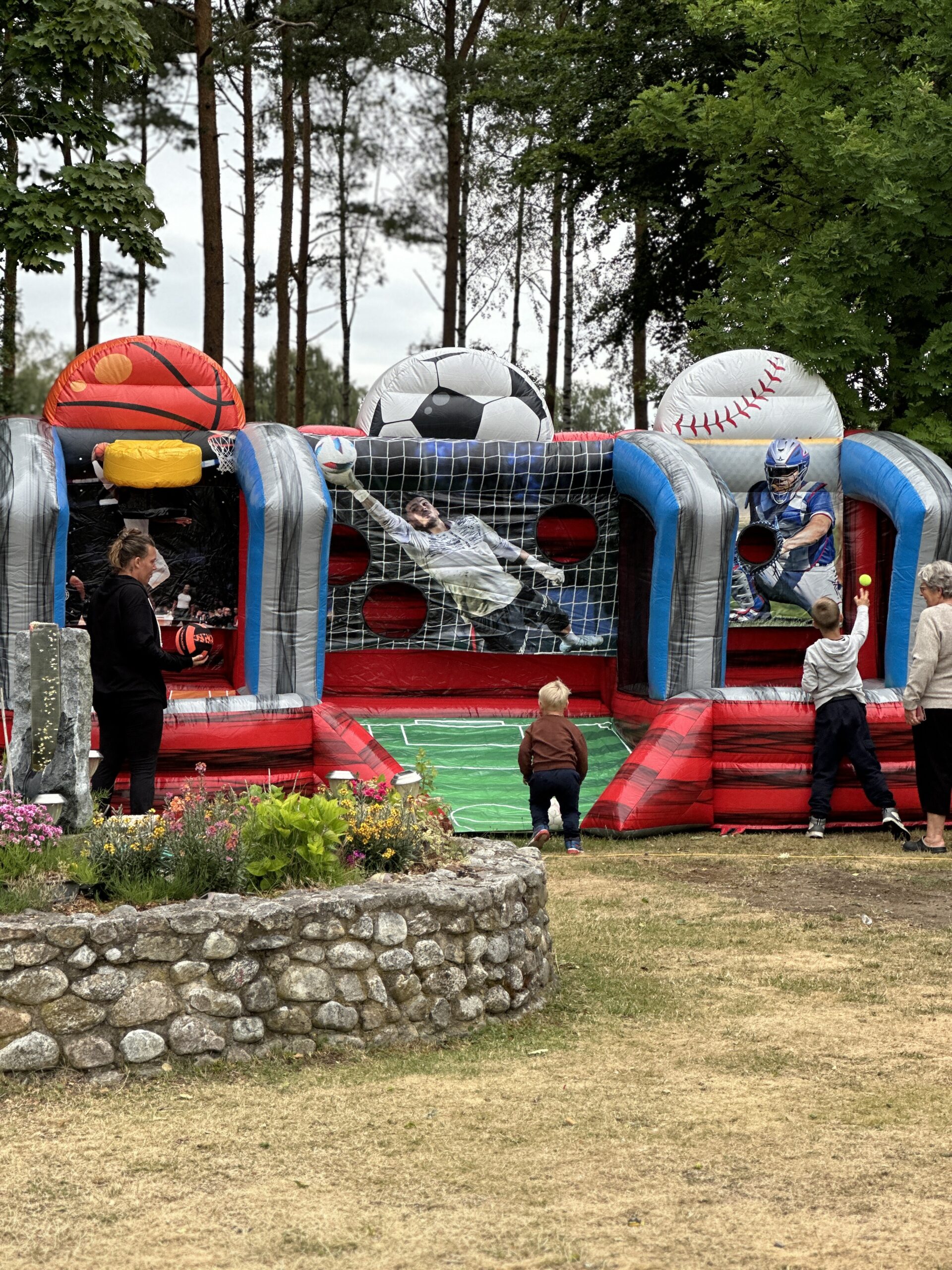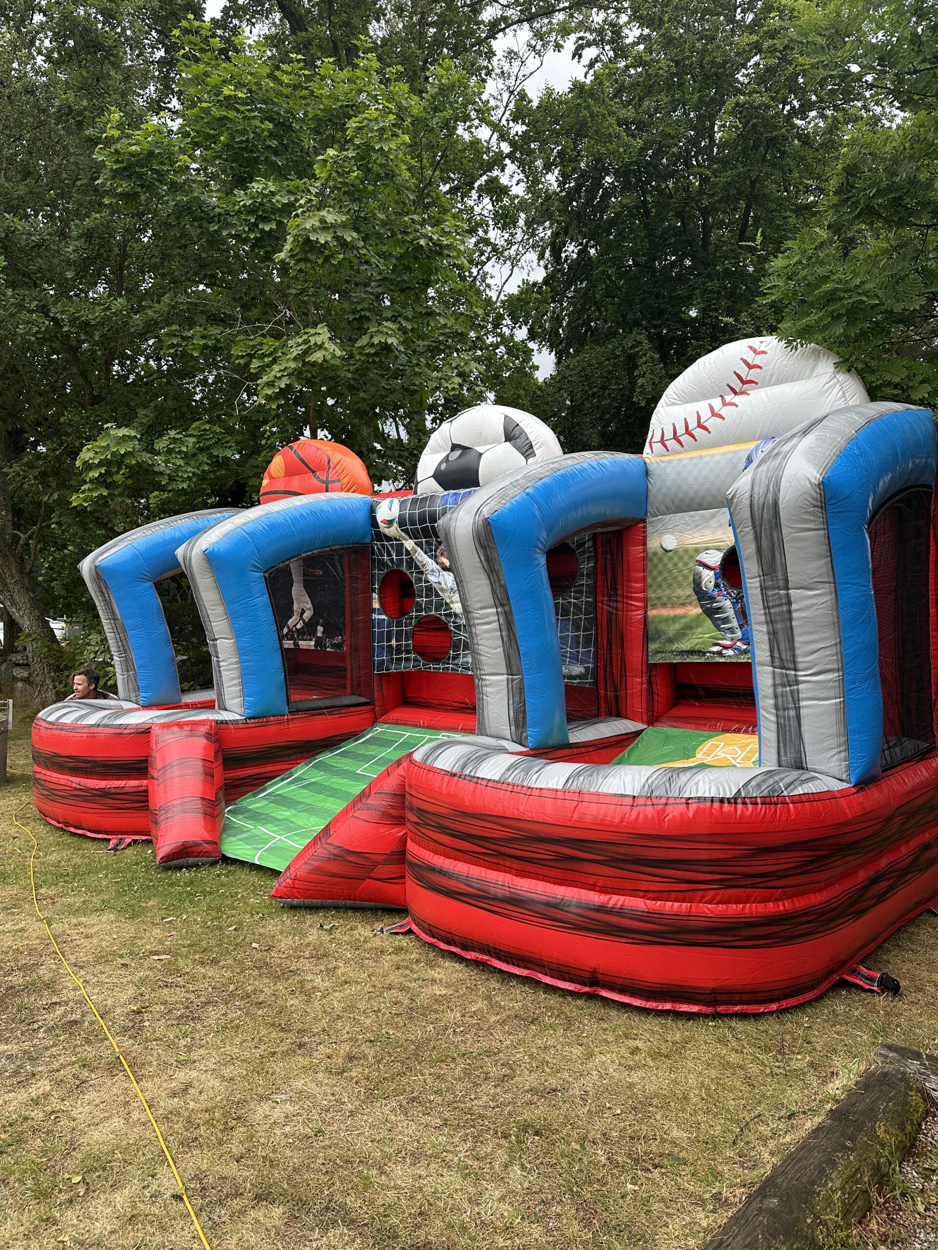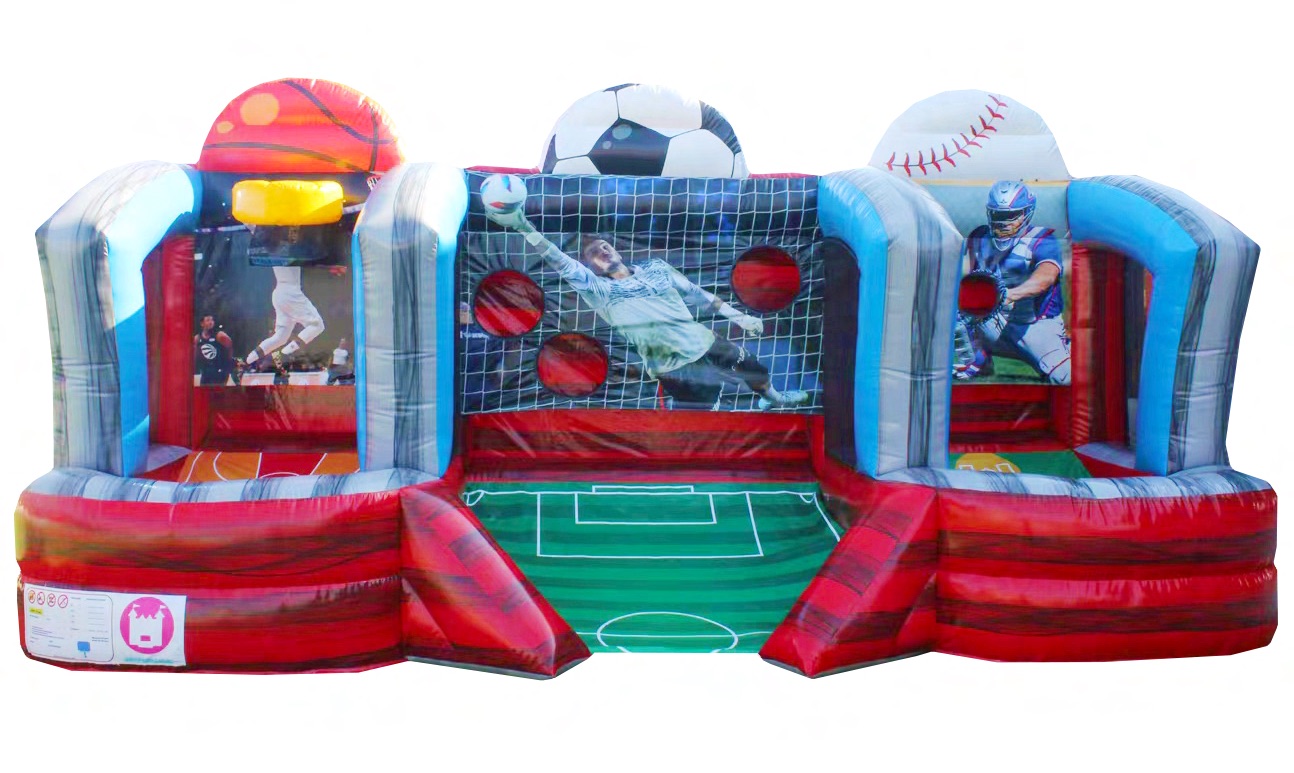 Roligt spel med tre spel i ett som skapar en naturlig tre-kamp. Baseboll, fotboll och basket!